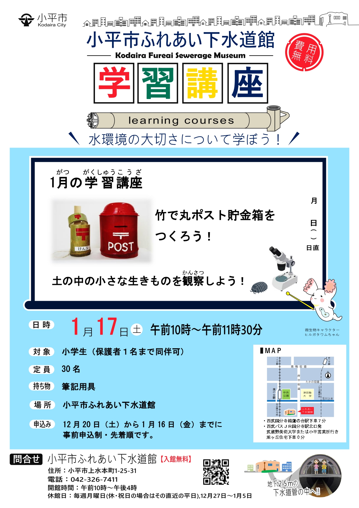 申込 12月20日(土)から1月19日(金)までに小平市ふれあい下水道館へ(事前申込制・電話可、先着順)
