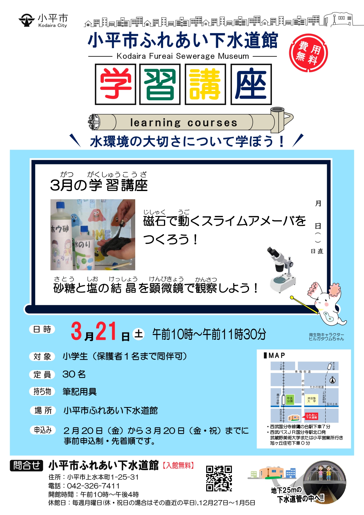 申込 2月20日(金)から3月20日(金・祝)までに小平市ふれあい下水道館へ(事前申込制・電話可、先着順)